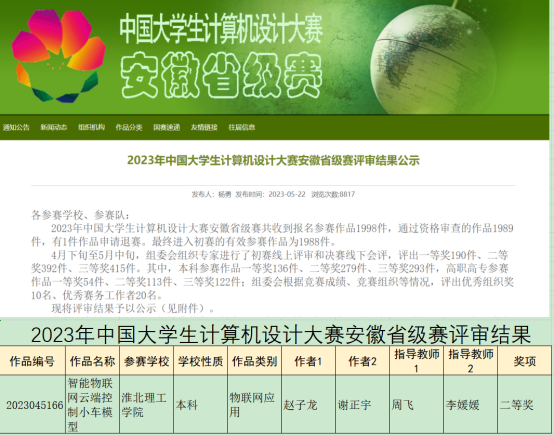 最终,由周飞、李媛媛老师指导的由赵子龙、谢正宇组成的参赛小组所创作的作品在“物联网应用类别中的城市管理方面”获得了省级二等奖,这是电信学院在该类赛事中获得的第二个奖项,体现了电信学院同学崇尚科学,敢于创新的学习风气。