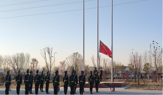 7点10分升旗仪式正式开始,在全体师生的注目礼下,英姿飒爽的护旗手迈着铿锵的步伐,护送着鲜艳的五星红旗来到国旗台前。在初升的太阳映照下,伴随着雄壮嘹亮的国歌响起,五星红旗在晨曦中迎风飘扬在学校的上空。