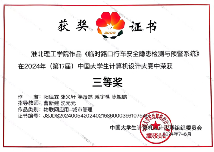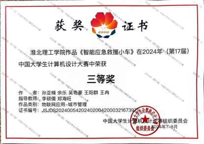2024年8月13日至17日,第17届中国大学生计算机设计大赛全国总决赛在厦门举行,由必赢官网教师李硕儒、郑海旺指导的孙亚楠、余乐、吴奇豪、王阳群、王冉所组成的参赛队伍的《智能应急救援小车》作品以及必赢官网教师曹新建、沈元元指导的阳佳霖、张义轩、李浩然、臧宇祺、陈旭鹏所组成的参赛队伍的《临时路口行车安全隐患检测与预警系统》作品,在众多参赛作品中脱颖而出,均获得国家级三等奖。