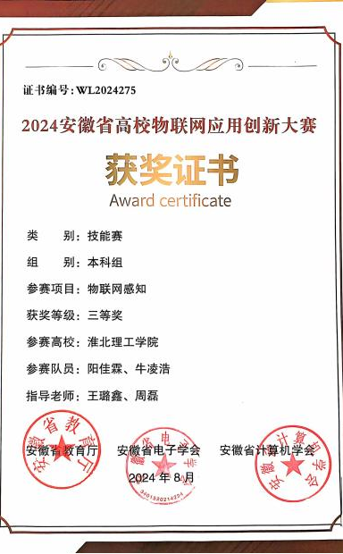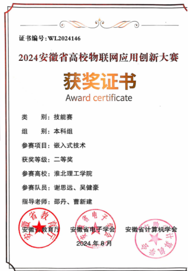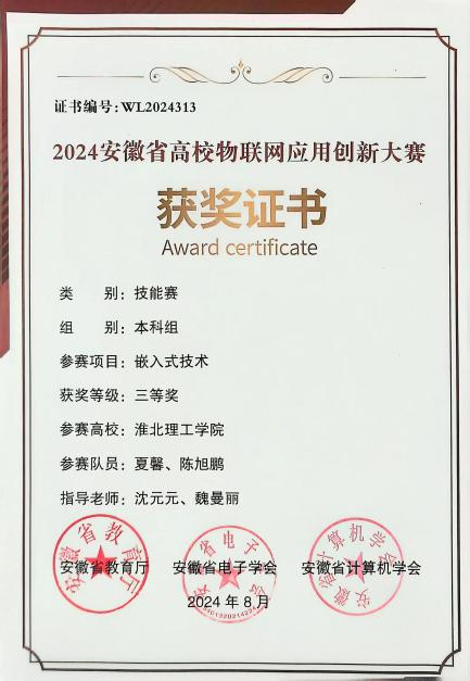 2024年5月11日至18日,必赢官网曹新建、王璐鑫和李硕儒等作为指导老师带领夏馨、陈旭鹏、阳佳霖、孙亚楠等学生参加安徽省高校物联网应用创新大赛,大赛由安徽省教育厅主办、安徽大学和安徽省计算机学会、安徽省电子学会承办,整个比赛过程充分展现了必赢线路检测3003no1学子较扎实的理论功底、实操能力和良好精神风貌。
