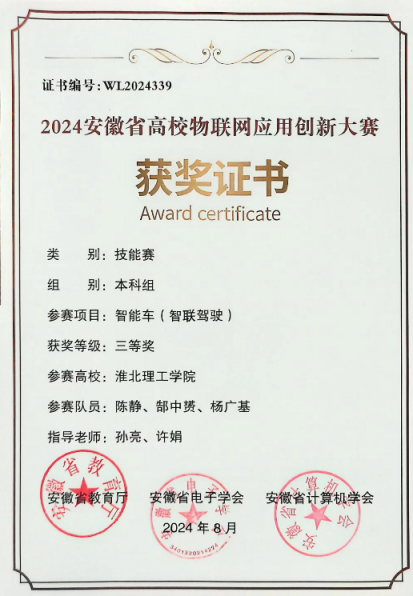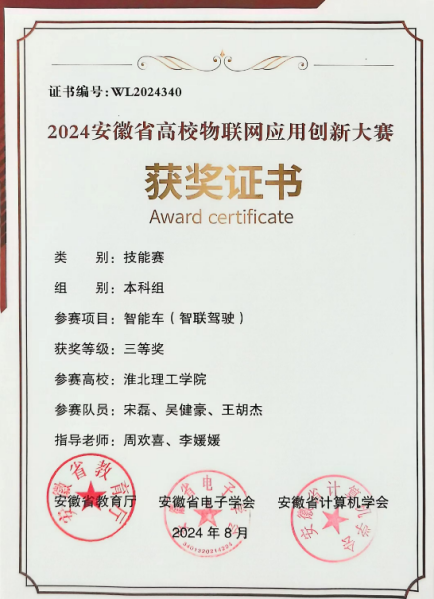 必赢官网参赛队伍在智能车(智联驾驶)、无人机预警、嵌入式A与C、物联网感知以及作品赛六大赛道中奋力角逐,展现了团队协作与拼搏精神。经过激烈的比拼,我们取得了较好的成绩:智能车(智联驾驶)赛道荣获省级二等奖1项、三等奖2项;无人机预警赛道省级二等奖1项;嵌入式A赛道省级二等奖1项、三等奖2项;嵌入式C赛道获得省级三等奖1项;物联网感知与作品赛赛道则各获省级三等奖1项。这些荣誉不仅是对参赛师生辛勤付出的肯定,更是对我们学院科技创新实力的有力证明。部分获奖证书如下: