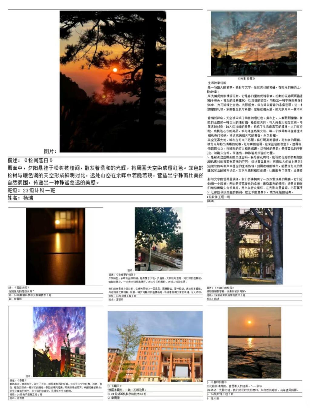 本次活动旨在打破艺术形式的界限,让镜头定格的瞬间与文字解构的情感相互交融。为同学们提供了展示创意和才华的平台,促进了摄影与文字创作的联动,激发了创作灵感,推动了两种艺术形式的融合。
