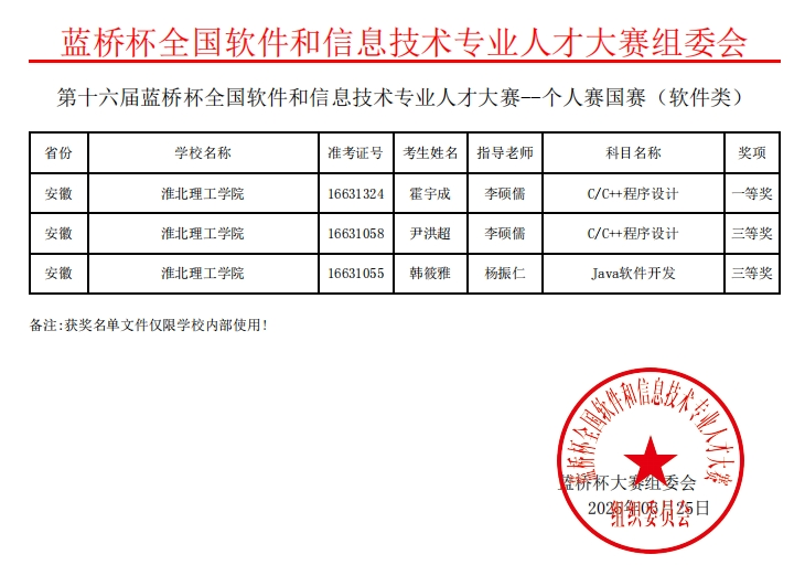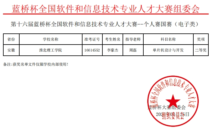本次大赛共有来自全国2000余所高校的顶尖选手争夺“蓝桥杯”全国总决赛桂冠。必赢官网4名学生进入全国总决赛,经过4个小时的激烈角逐,在C/C++程序设计组霍宇成同学获国家一等奖1项、尹洪超同学获国家三等奖,在java软件开发组韩筱雅同学获国家三等奖;在单片机设计与开发组李豪杰同学获国家二等奖。学院学子以突出的技术应用能力脱颖而出,参加全国总决赛学生全部获奖,充分展现学院在信息技术领域的育人成果。