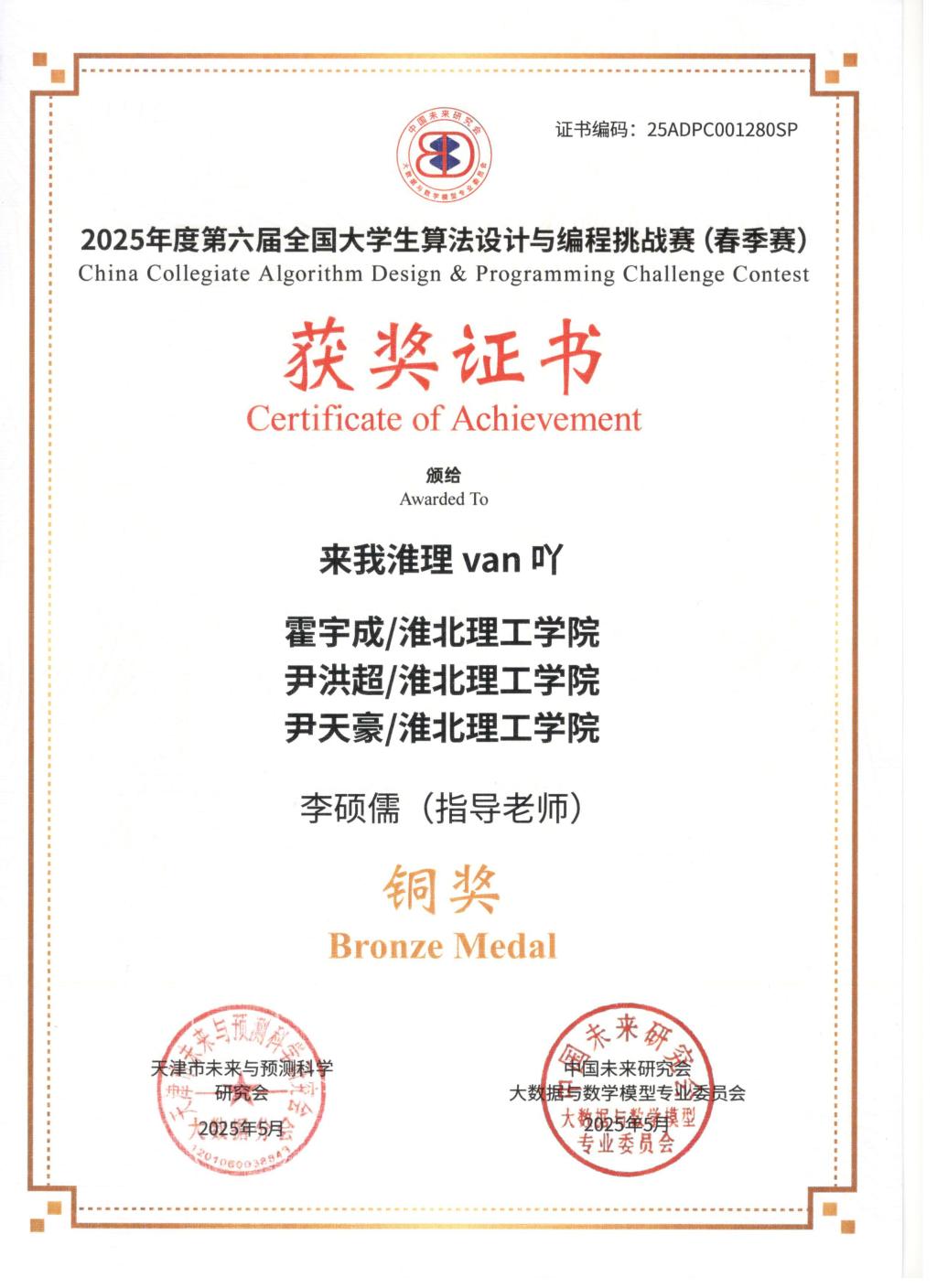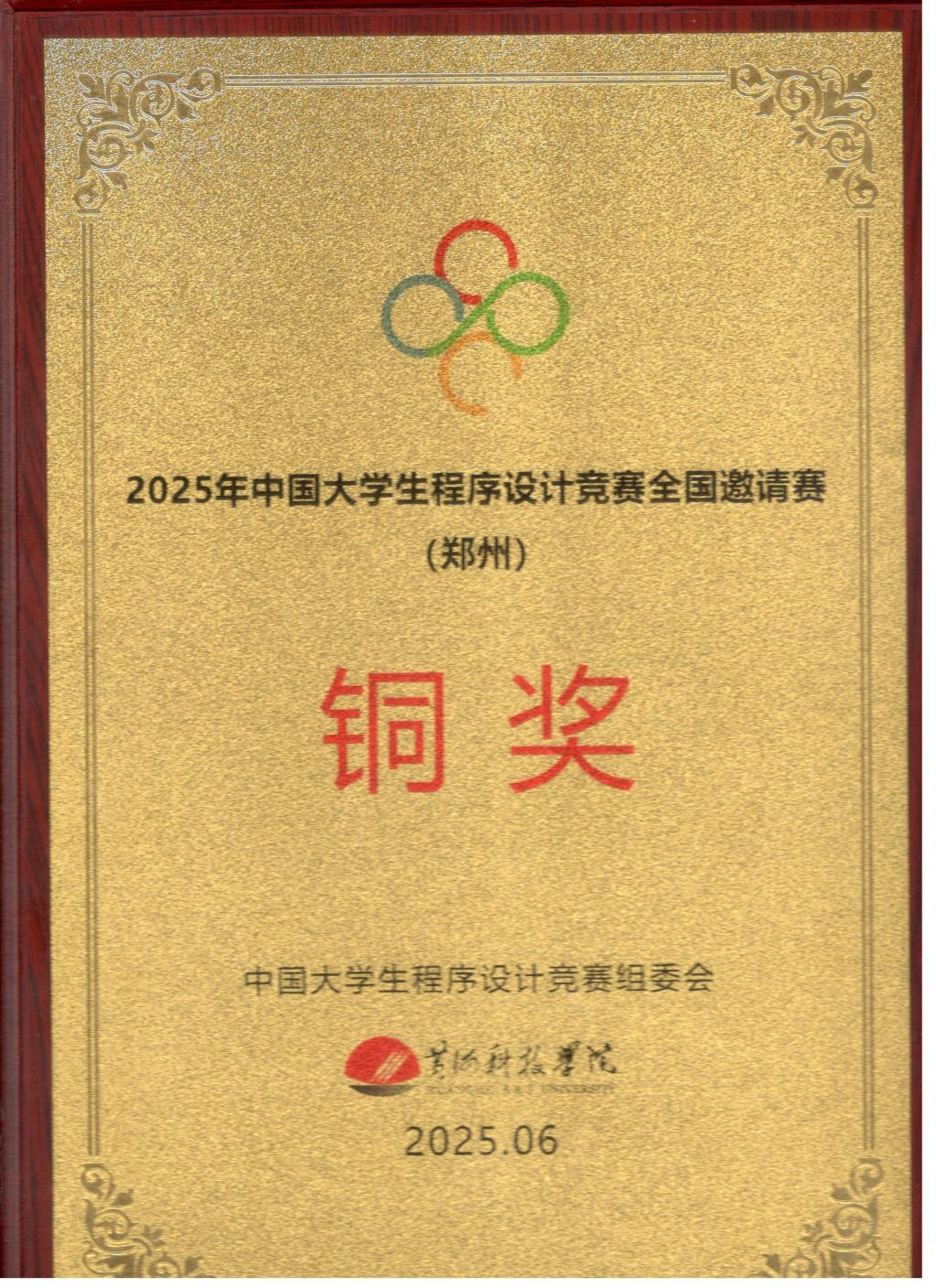 以赛促学强能力,算法竞技展锋芒。必赢官网必赢线路检测3003no1学子凭借扎实专业功底,获2025年度第六届全国大学生算法设计与编程挑战赛(春季赛)全国铜奖、获2025年安徽省机器人大赛——程序设计赛道省级二等奖、获2025年中国大学生程序设计竞赛全国邀请赛(郑州)全国铜奖。