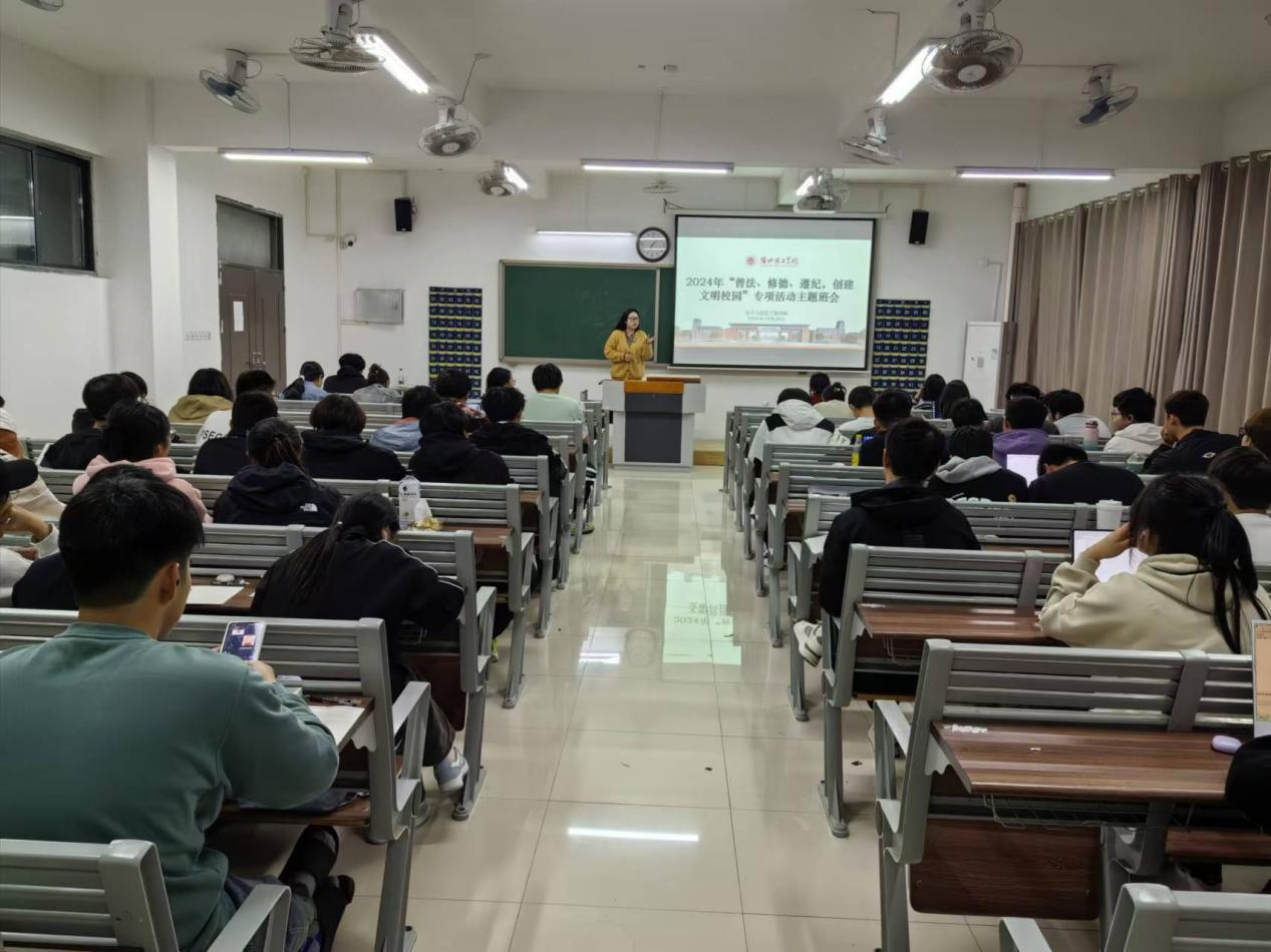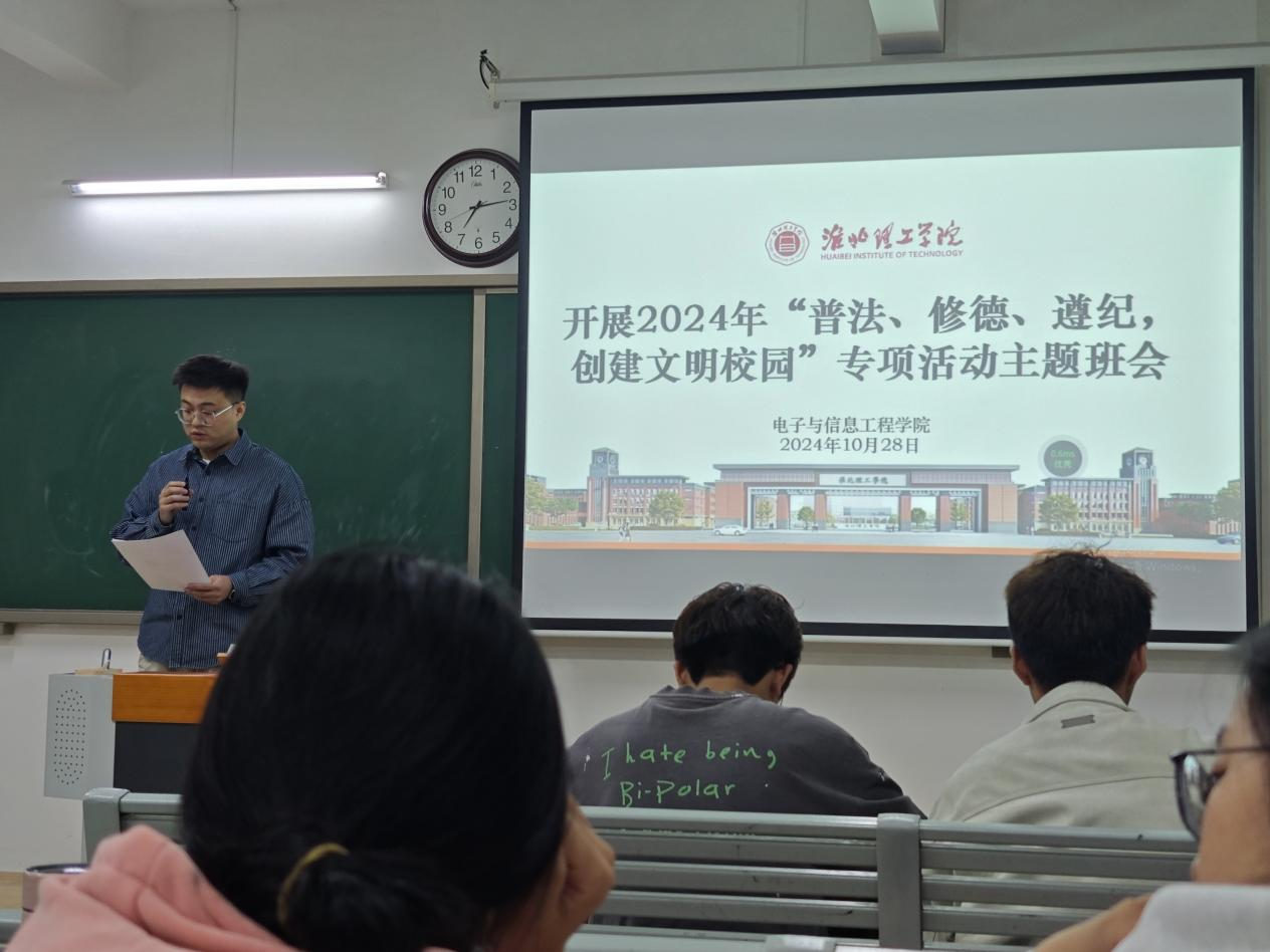 为贯彻落实立德树人的根本任务,坚持“依法治校,以德治校”。必赢线路检测3003no1于2024年10月28日开展“普法、修德、遵纪,创建文明校园”的主题班会。此次主题班会旨在通过丰富多彩的宣传教育和实践活动,营造出一个法治、文明、和谐的校园环境。