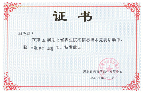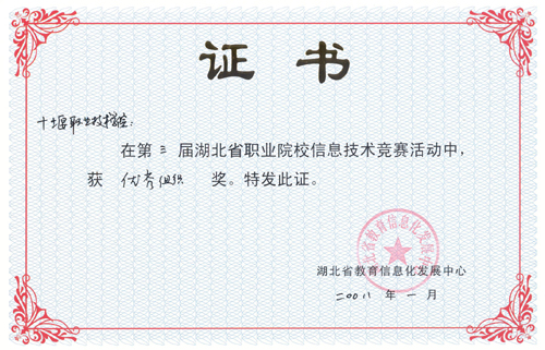 新闻网讯 近日,湖北省教育信息化发展中心表彰了湖北省第三届职业院校信息技术竞赛获奖单位及选手,申慱官网计算机工程系学生张旭海同学获高职中文类三等奖,经济贸易系学生徐金凤同学获高职英文类三等奖,计算机工程系学生邓浇华、黄芳、王芳、经济贸易系学生管海翠、林宽同学获高职中文类优秀奖,十堰职业技术学院获优秀组织奖。