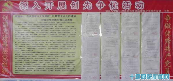 会上,该系党员认真学习了《中共十堰职业技术学院委员会关于深入推进创先争优活动的实施方案》和《国家中长期教育改革和发展规划纲要(2010-2020年)》。组织党员填写党员公开承诺书,宣布了“创先争优”领导小组及活动方案。活动方案围绕骨干校建设、内涵建设、工学结合、校企合作、顶岗实习、人才培养模式创新以及学生在学风建设、文化建设、文明宿舍建设等方面做了具体安排部署。