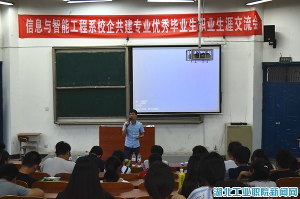 新闻网讯(学生记者 张新)“我们从这里起航,走向遥远的地方。当我们走向明天,又怎能把昨日遗忘……”622日晚6:30,信息与智能工程系校企共建专业在4101教室举办首届优秀毕业生交流会。校企共建专业就业办主任肖海霞应邀出席,2013级优秀毕业生及2015级校企共建专业全体学生参与本次交流会。
