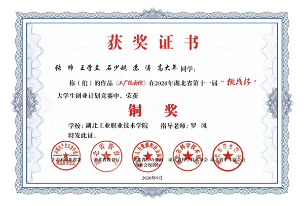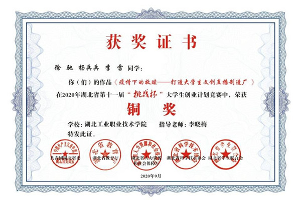 新闻网讯(通讯员李晓梅)近日,第十一届“挑战杯”湖北省大学生创业计划竞赛落下帷幕,申慱官网双创团队斩获两枚铜奖。sunbet申慱官网2018级电气自动化技术专业张帅学生团队项目《工厂级云控》、sunbet申慱官网2019级电气自动化技术专业徐驰学生团队项目《疫情下的救赎——打造大学生文创直播制造厂》获大赛铜奖。
